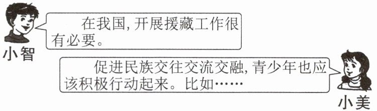 (1)必要性:①有利于促进西藏地区经济社会发展,缩小东西部地区差距,实现共同富裕。②有助于维护民族团结和国家统一,巩固平等团结互助和谐的社会主义民族关系。③能够加强各民族之间的交流合作,促进民族文化交流交融,增强中华民族的凝聚力和向心力。小美对话补充:青少年可以尊重各民族的风俗习惯、语言文字和宗教信仰;积极参与学校或社区组织的民族交流活动,与各民族同学友好相处,互帮互助;宣传民族政策和民族团结的重要性;等等。
