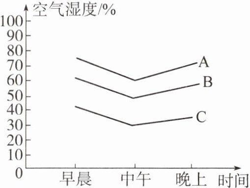 (4)如果把表格中的数据绘制成下图,则曲线A表示一天中______的空气湿度变化。从坐标曲线图中可以了解到中午时段空气湿度最______。