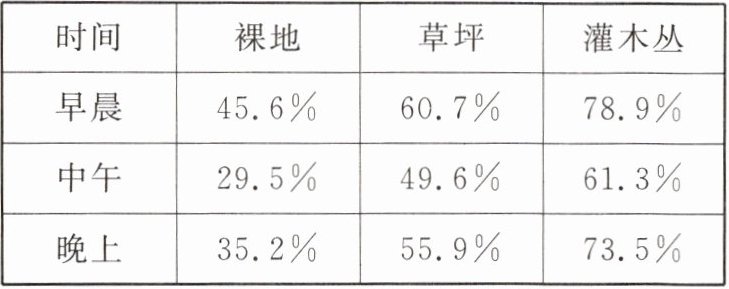 24. (11分)某合作学习小组探究不同植被对空气湿度的影响。选择裸地、草坪和灌木丛3种不同的植被环境,在一天内,选择早晨、中午、晚上3个时间段进行空气湿度的测量。多次测量后得到几组平均数据,记录在下表中。据此回答下列问题。