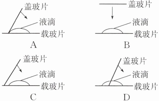 7. 下图表示制作临时装片时盖盖玻片的操作,其中正确的是 ( )