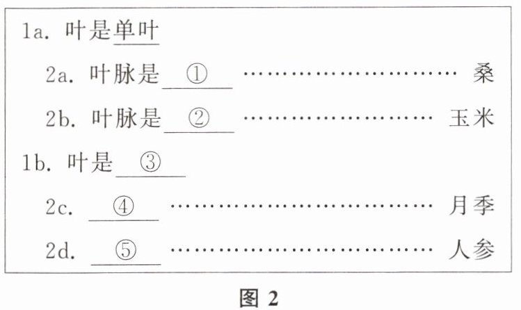 (3)图2所示的检索表第一次分类以是否为单叶来划分,除此之外,也可以 来划分。( )