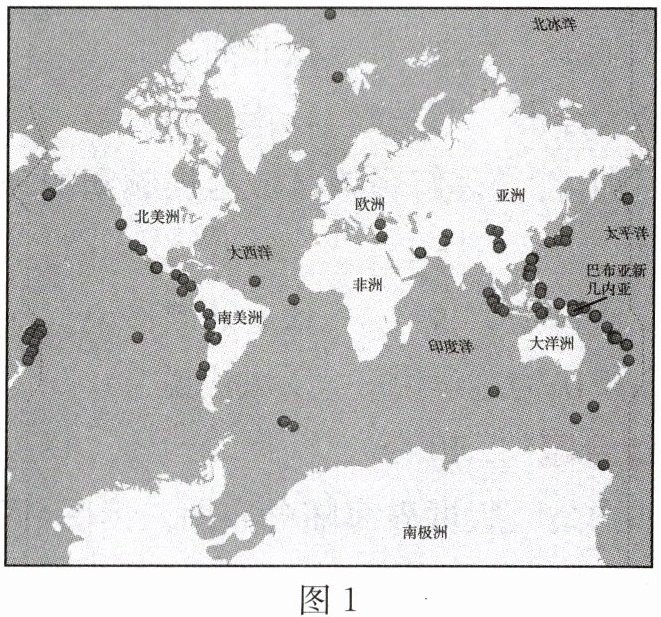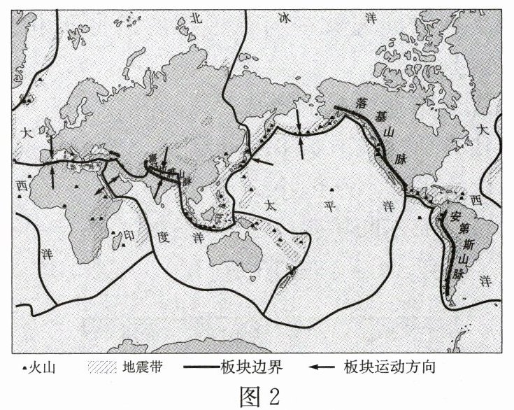 2022年,全球共发生里氏6.0级及以上地震112次,其中里氏6.0—6.9级105次,里氏7.0—7.9级7次,里氏8.0级及以上0次。最大地震是9月11日在巴布亚新几内亚发生的里氏7.6级地震。图1为2022年全球里氏6.0级及以上地震活动分布图,图2为六大板块分布示意图。读图,回答17~18题。