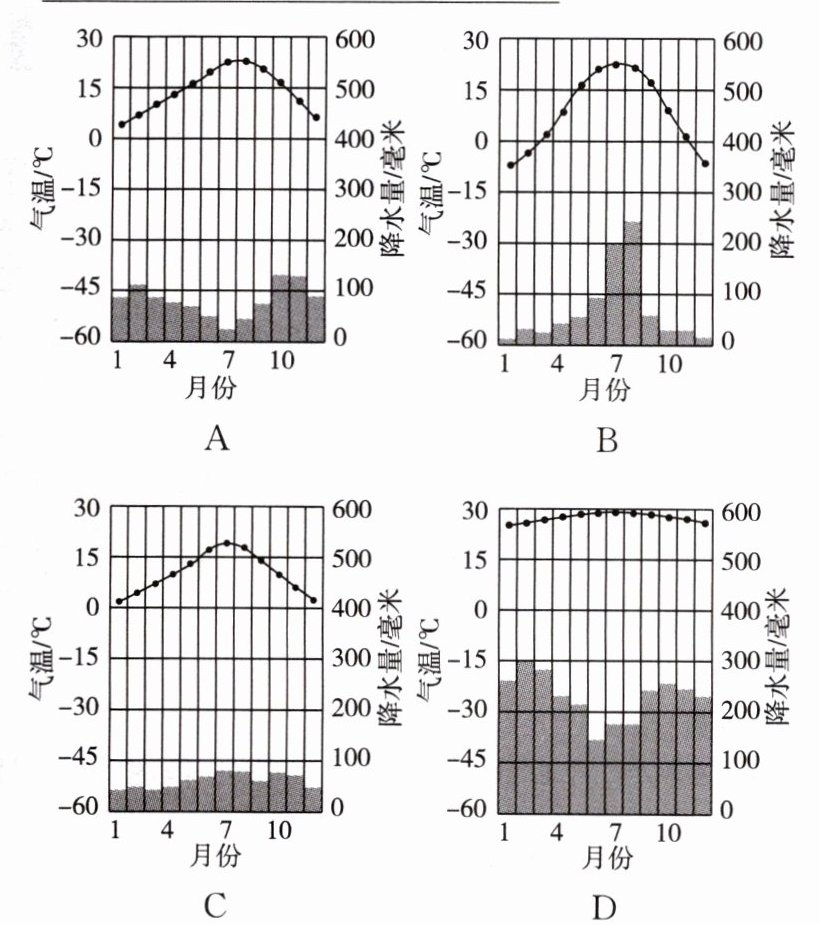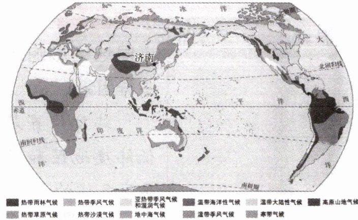 (2)下图中能反映济南的气候类型的是_C_(填字母)。该气候类型一般分布在_南北纬30°—40°的大陆西岸_。