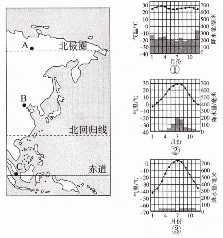 把三幅气温曲线与降水量柱状图和图中A、B、C三地对应连线。