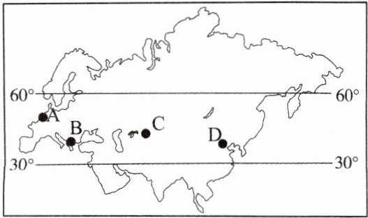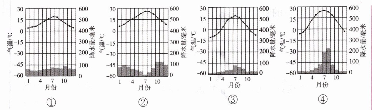 把四幅气温曲线与降水量柱状图填在上图中A、B、C、D四地对应位置。