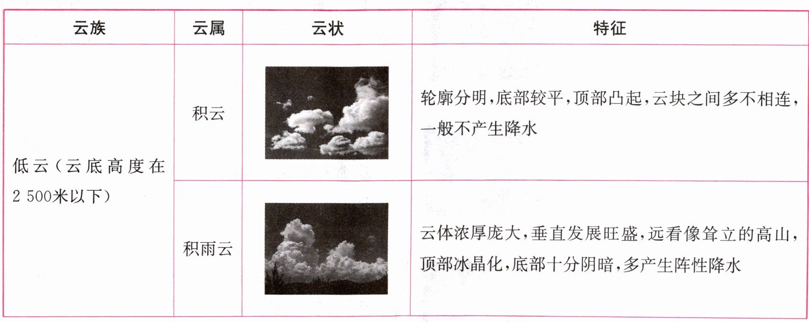 任务一:层云:云体均匀成层,呈灰色或灰白色,像雾,云底很低但不接触地面;卷云:云体具有纤维状结构,常呈白色,无暗影,有柔丝般的光泽。任务二分析示例:照片(积云);介绍:此为低云中的积云,轮廓分明,底部较平,顶部凸起,云块之间多不相连,一般不产生降水,是天气晴朗的象征。讨论示例:谚语“朝霞不出门,晚霞行千里”;影响:朝霞预示可能有阴雨天气,农民需提前做好防雨准备,避免晾晒农作物;晚霞预示天气晴朗,适合安排户外活动或农业生产。