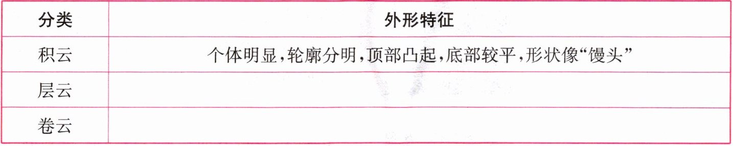 描述:参考示例,在下表中分别填写层云和卷云的外形特征。