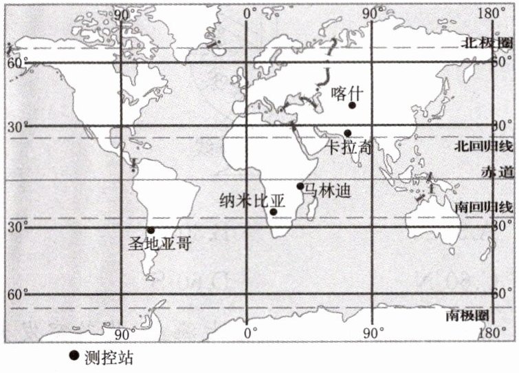 北京时间 2024 年 4 月 30 日 17 时 46 分,“神舟十七号”载人飞船返回舱在东风着陆场成功着陆。读我国部分陆上航天测控站世界分布图,回答 8~9 题。