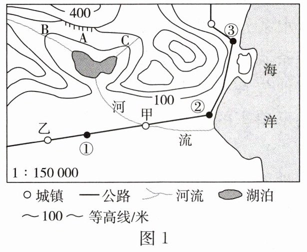 (4)此等高线地形图的等高距为____米。若甲村到乙村的图上距离为2厘米,则它们的实地距离是____千米。(2分)