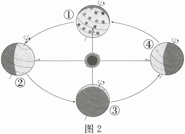 (3)图2中,地球公转运动从②到③的这段时间内,山东的白昼时间将越来越____(填“长”或“短”),此时山东的昼夜长短状况是____。(3分)
