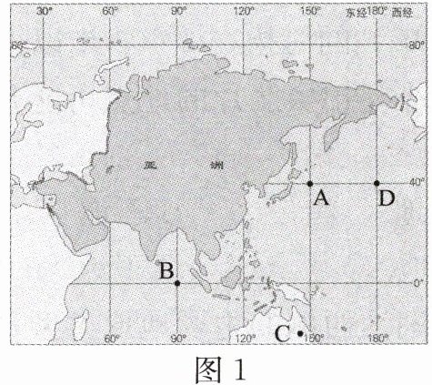(1)图1中A地的经纬度是____;A、D两地更早见到日出的是____地。(3分)