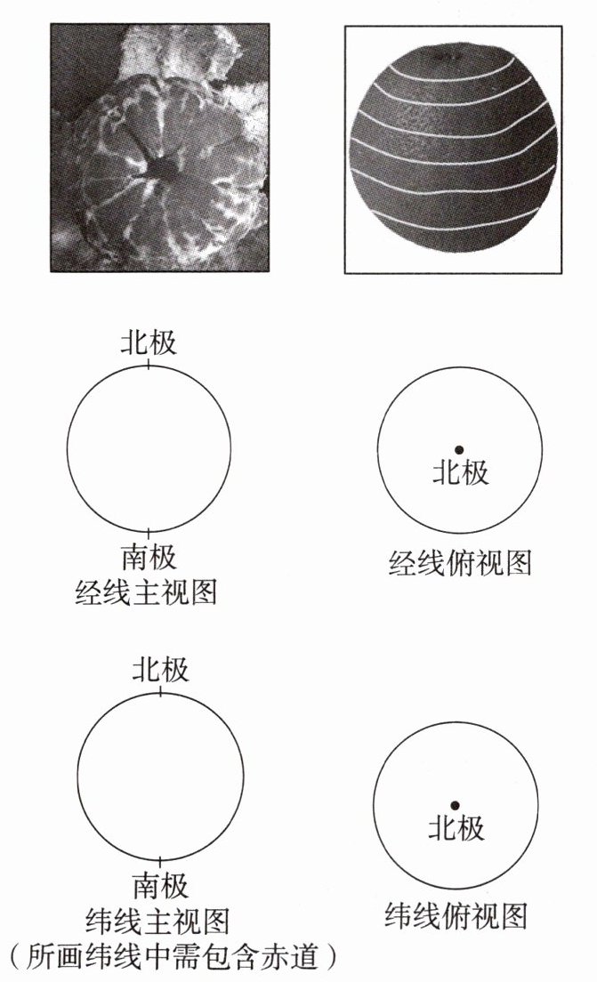 (3)剥开橘子,观察橘瓣隔膜(代表经线)形状,绘制经线的主视(从侧面观察)图、俯视(从北极上空观察)图。