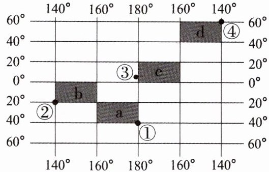 14. 救援队员小峰发现经纬网图中标注的四处阴影区域面积一样大,实地面积最小的是( )