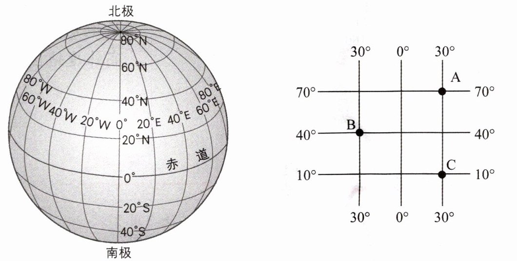 3. 写出图中A、B、C三地的经纬度。