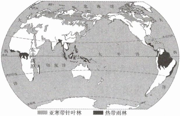 下图为全球热带雨林和亚寒带针叶林分布示意图。据此回答13~15题。