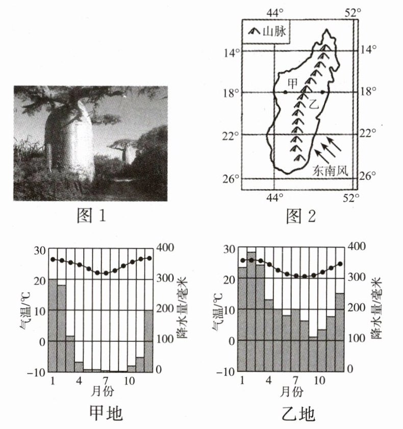 猴面包树是热带草原中一种非常奇特的乔木,树干粗大,喜温耐旱,干季时落叶以减少水分蒸腾,湿季时可大量储水于树干中。读猴面包树景观图(图1),甲、乙两地位置图(图2)及甲、乙两地气候资料图,回答16~18题。