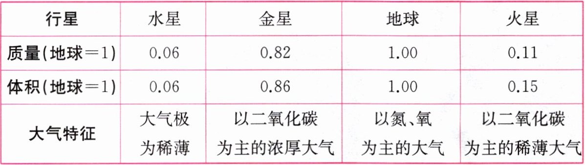 |质量(地球 = 1)|0.06|0.82|1.00|0.11|