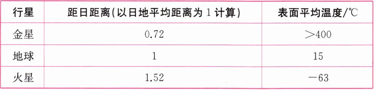 (1)距日距离越近,行星表面的平均温度越高;距离越远,平均温度越低(合理即可)
