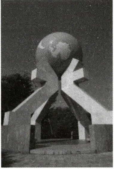 北回归线穿过广东省汕头市,该市被北回归线穿过的地区每年有一次太阳直射现象。下图为汕头市北回归线标志塔,"北"字形支架支撑着直径5米的地球模型,模型设计有垂直贯穿球心的钢管,可通过钢管从地面仰窥天空。据此回答15~17题。