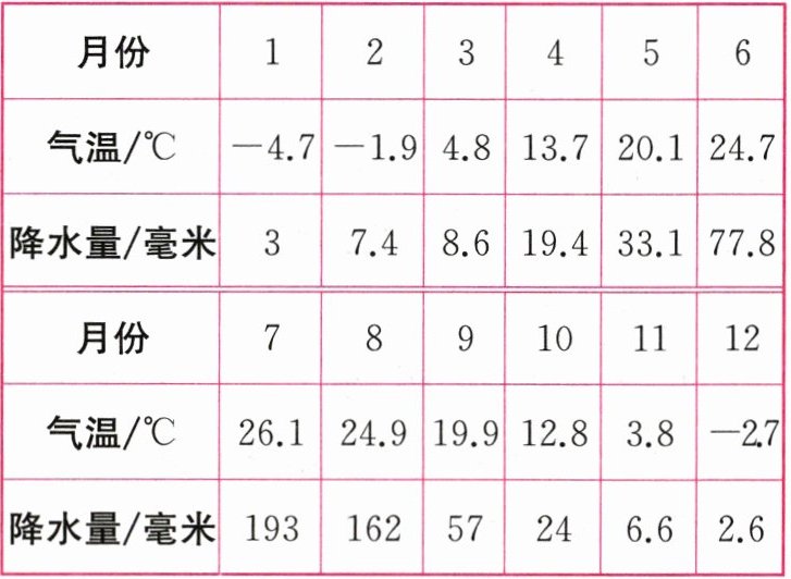 |降水量/毫米|193|162|57|24|6.6|2.6|