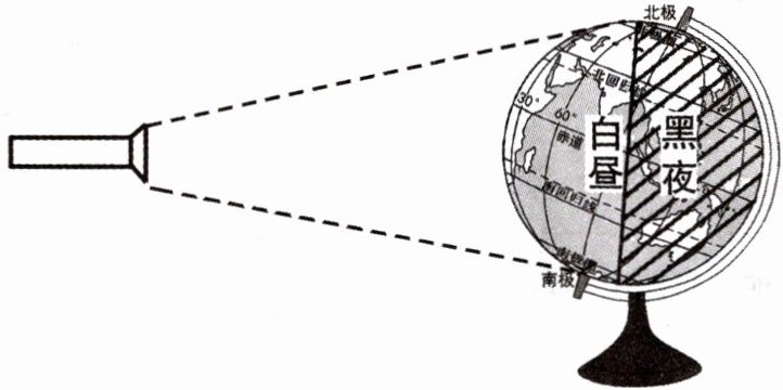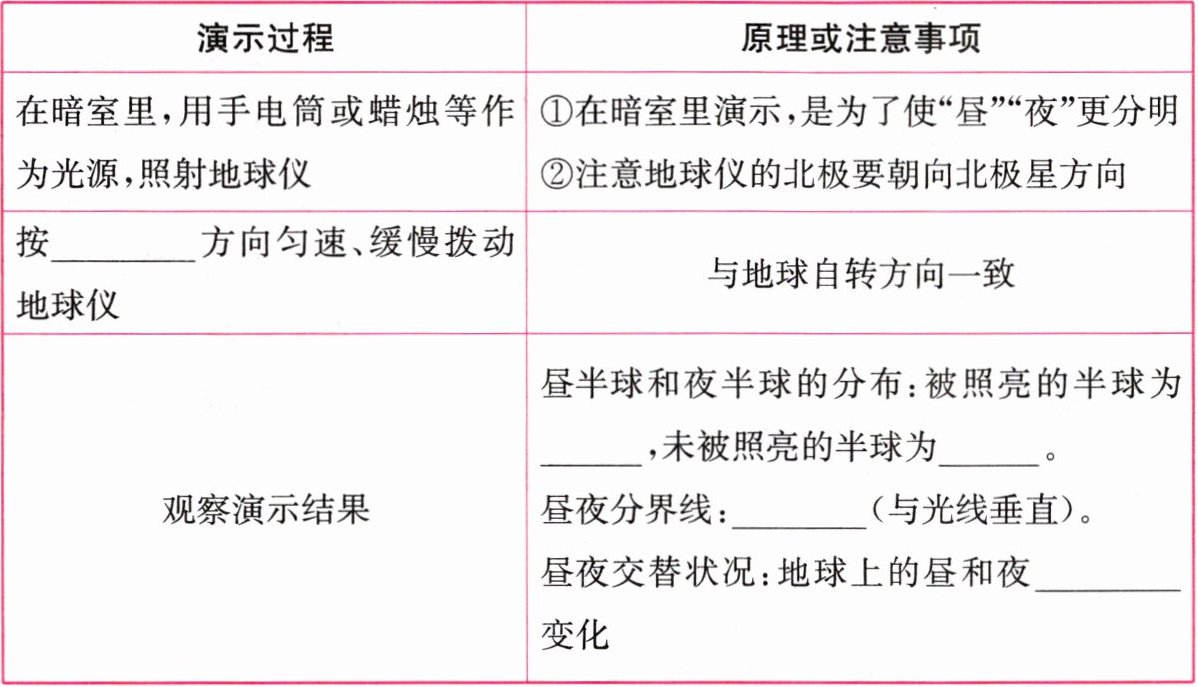 |在暗室里,用手电筒或蜡烛等作为光源,照射地球仪|①在暗室里演示,是为了使“昼”“夜”更分明②注意地球仪的北极要朝向北极星方向|