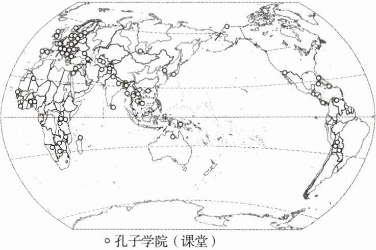 中国文化通过孔子学院(课堂)在世界各地广泛传播,目前我国已在 160 多个国家和地区建立了 500 多所孔子学院和 1 000 多个孔子课堂。下图为部分孔子学院(课堂)的世界分布图。读图,回答 10~12 题。