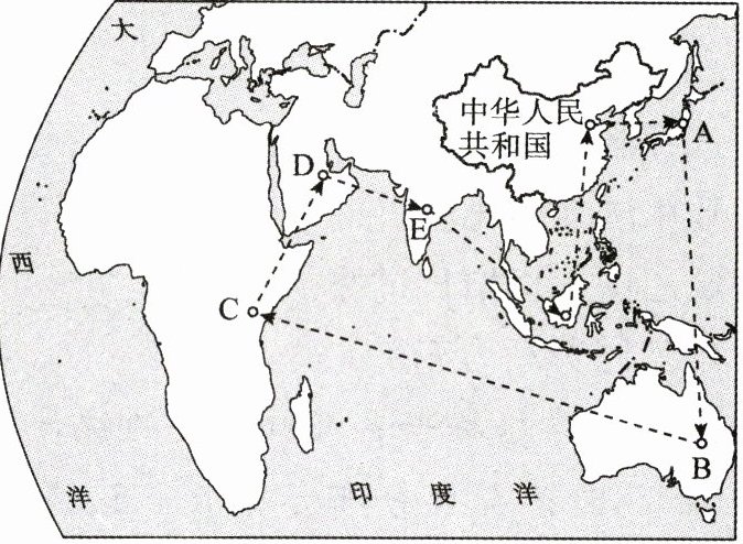 22. 某中学地理老师为学生设计了一个“环游世界”的网络模拟旅游主题学习任务,图中箭头表示网络模拟旅游线路。读图,回答下列问题。(8 分)