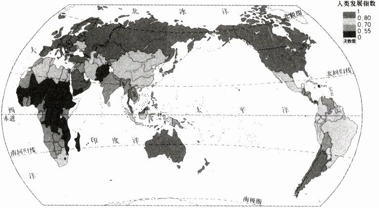 (1)半球位置:人类发展指数较高的地区主要分布在北半球;人类发展指数较低的地区主要分布在北半球南部和南半球。