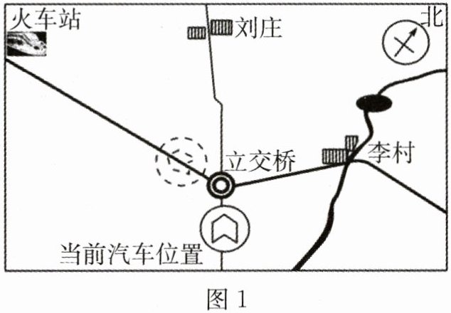 3. 地图是日常生活中必不可少的工具。小明同学乘坐汽车去火车站,出行路线如图1所示,小明到达立交桥时看见一个路标,如图2所示。下列小明对路标的判断,错误的是( )