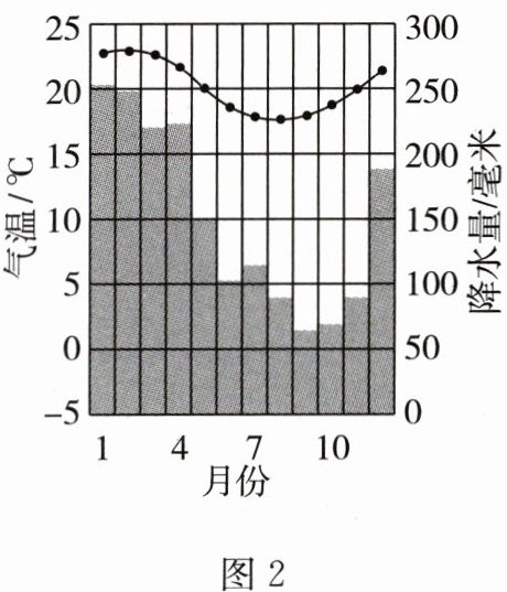 2. 下图是小明查阅到的相关资料,图1为毛里求斯简图,图2为毛里求斯气候资料图。他根据资料对该国自然环境作出以下判断,合理的是( )