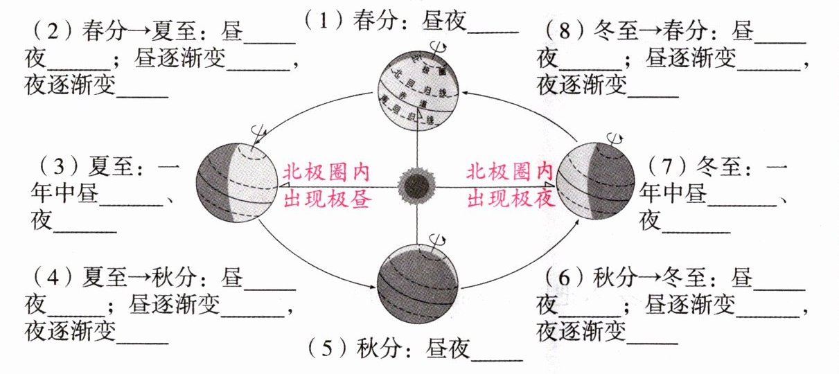 (8)冬至→春分:昼______夜______;昼逐渐变______,夜逐渐变______