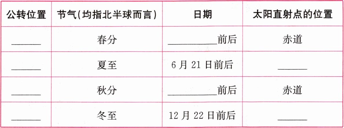 |公转位置|节气(均指北半球而言)|日期|太阳直射点的位置|