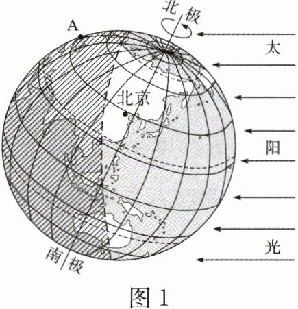 (1)如图1所示,太阳直射的纬线是______;此时,北京和A地的时间不同,产生这种时间差异的主要原因是______;该日南极圈内夜长约为______小时。(6分)