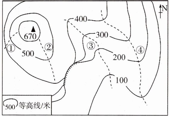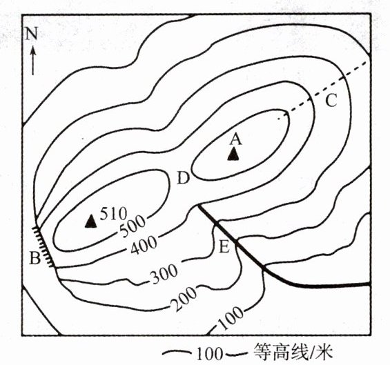 4. 图上B、C、D、E依次表示的地形部位是( )