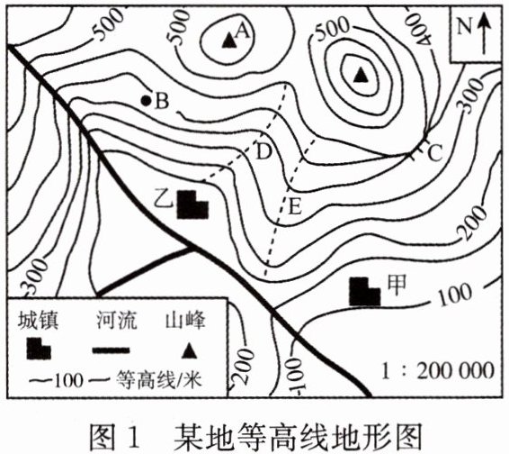 (1)图1中A山峰与B点的相对高度在______米,同学们测得甲村到乙村的图上距离约为2.5厘米,则两村的实地距离约为______。