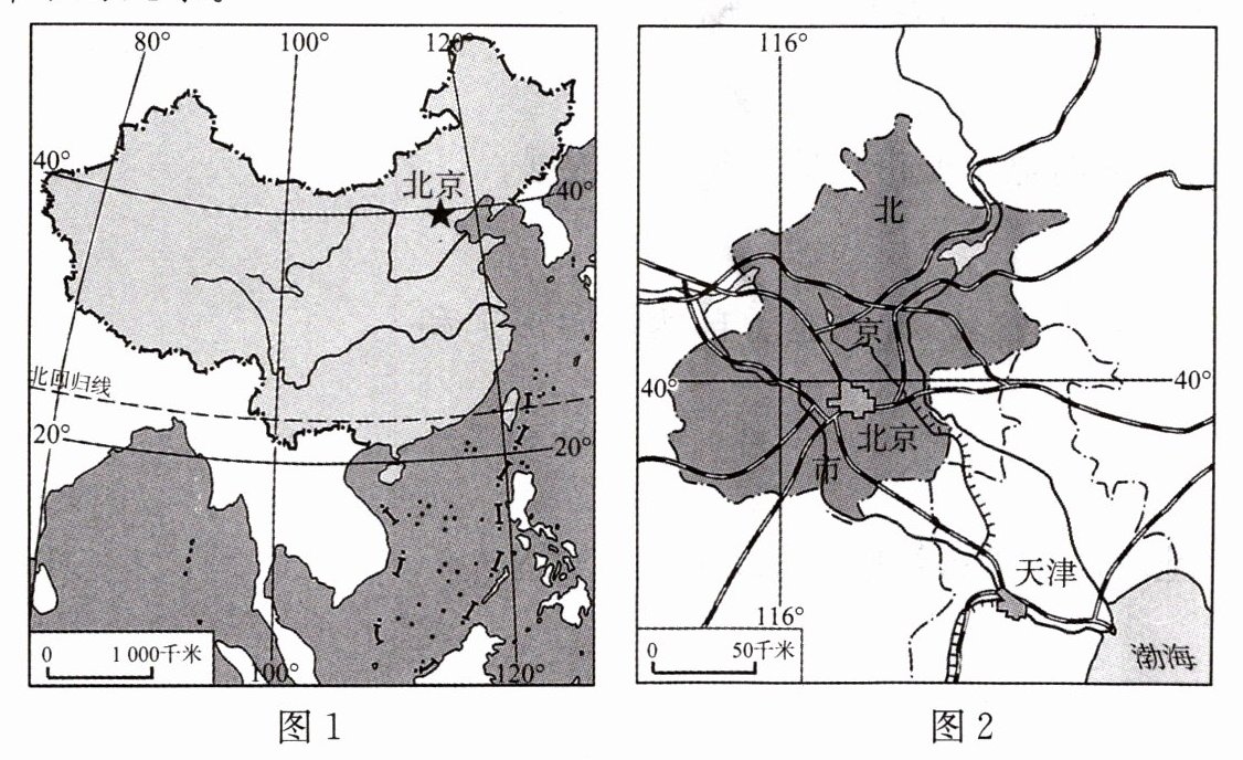 4. 根据两图中显示的北京信息的多少,推断比例尺大小与地图表示的内容详略的关系。