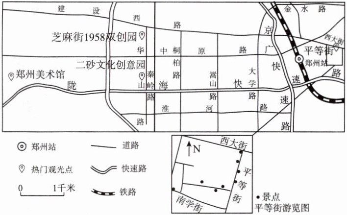 近年来,河南郑州将一些旧城街道、废弃工业厂区改造成了热门观光点。暑假期间,小明专程乘坐火车到郑州游览。下图为郑州热门观光点示意图及平等街游览图。