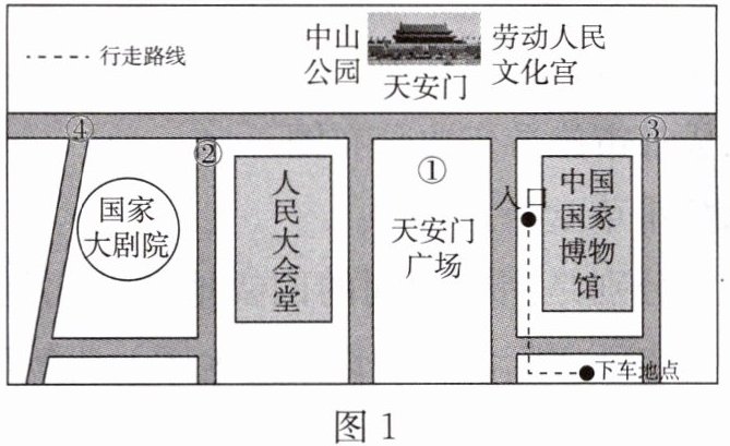 小明假期参加了“天安门广场升旗仪式”和“走进中国国家博物馆”的社会大课堂实践活动。图 1 为天安门及附近地区平面图,图 2 为某同学拍摄的照片,据此回答 7~8 题。