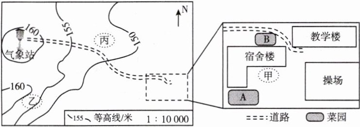 (3)①甲 ②乙地块等高线最密集,坡度最陡,建水土保持园有利于保持水土 ③丙 丙地块距离宿舍楼更远,更卫生