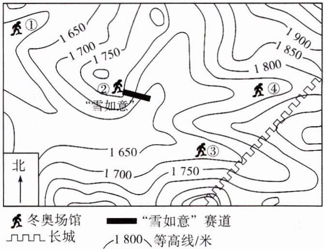 (河南中考)在2022年北京冬奥会崇礼场馆区,现代化的冬奥场馆和古老的长城不期而遇。国家跳台滑雪中心因外观造型与我国传统玉如意形状相似,被称为“雪如意”。下图为崇礼部分地区等高线地形图。读图,回答8~9题。