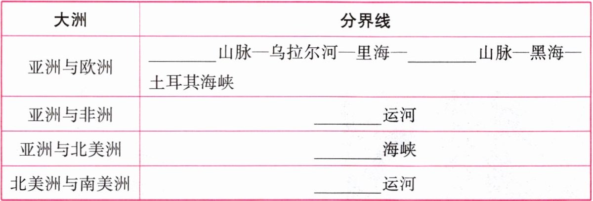 填图·绘图 ①略。 ②从左到右,从上到下:北美洲 南美洲 欧洲 亚洲 非洲 大洋洲 南极洲 ③略。 1.亚洲 大洋洲 2.南美洲 非洲 亚洲 3.非 4.乌拉尔 大高加索 苏伊士 白令 巴拿马 5.欧洲 亚洲 北美洲、南美洲 非洲 大洋洲 南极洲