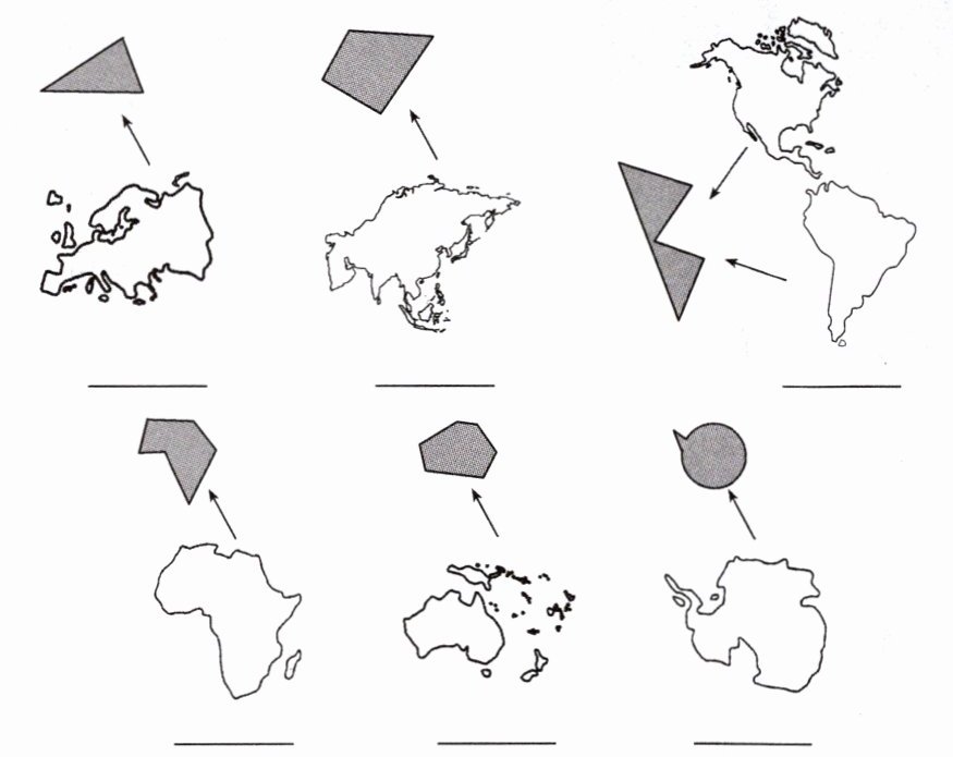 5. 如果把各大洲轮廓大致勾勒成图形,说出下列轮廓分别对应了哪个大洲。在对应横线上写出来。