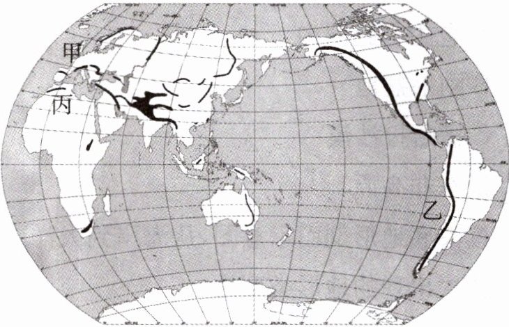 (4)图中甲山脉位于______洲南部,乙山脉位于______洲西部,丙山脉位于______洲北部。