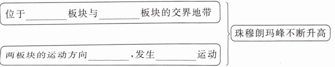 A[位于____板块与____板块的交界地带] --> B[珠穆朗玛峰不断升高]
