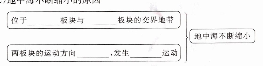 A[位于____板块与____板块的交界地带] --> B[地中海不断缩小]