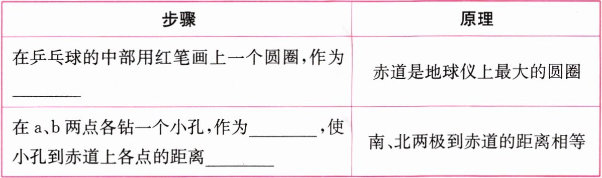 |在乒乓球的中部用红笔画上一个圆圈,作为______|赤道是地球仪上最大的圆圈|