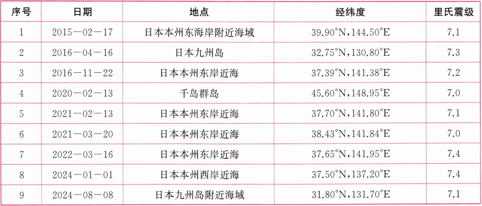 |5|2021 - 02 - 13|日本本州东岸近海|$37.70^{\circ}N$,$141.80^{\circ}E$|7.1|