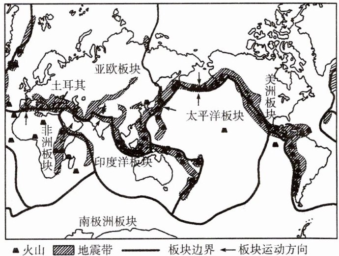 1. (广东中考) 土耳其是地震多发的国家。2023年2月6日, 土耳其发生里氏7.8级强烈地震, 人员伤亡严重。读六大板块分布图, 土耳其地震多发的主要原因是该国位于 ( )