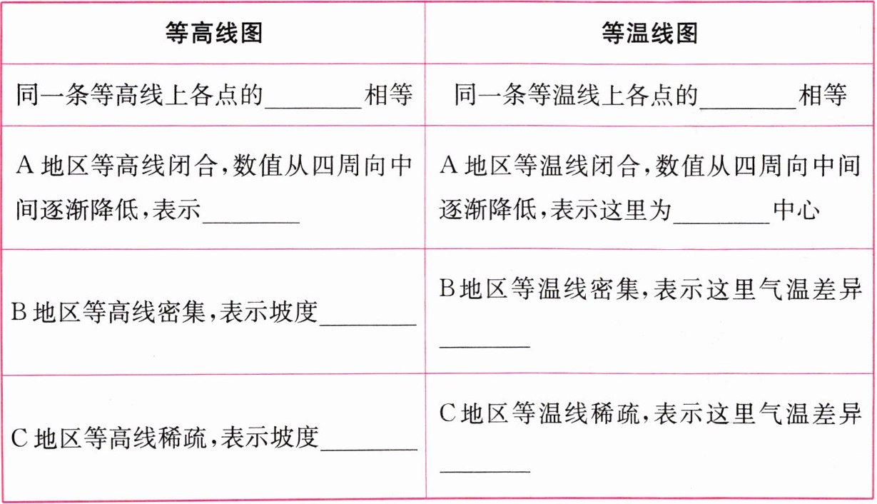 |同一条等高线上各点的______相等|同一条等温线上各点的______相等|