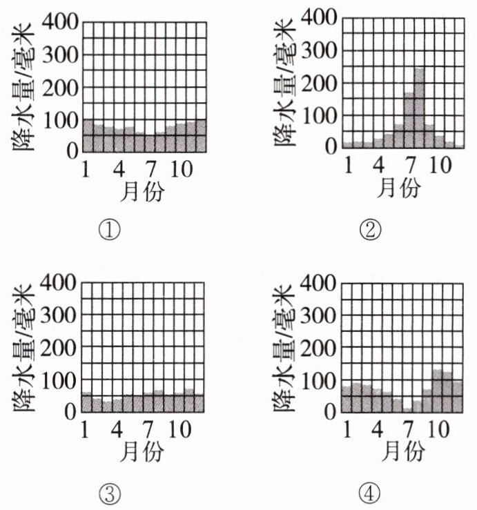 读北半球①②③④四地多年平均各月降水量柱状图,回答7~9题。